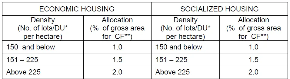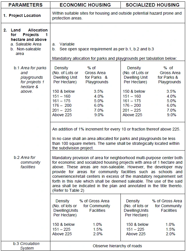 - Mandatory provision of area for neighborhood multi-purpose center both for economic and socialized housing projects with a gross area of 1 hectare and above. These areas are non-saleable. However, the developer may provide for areas for community facilities such as schools and convenience/retail centers in excess of the requirement set forth in this Rule which shall be deemed saleable. The use of the said area shall be indicated in the plan and annotated in the title thereto. (Refer to Table 2)