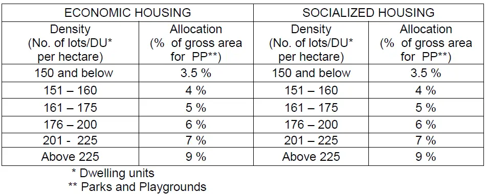 - Area allocated for parks and playgrounds shall be mandatory for projects 1 hectare or above and shall be strategically located within the subdivision project. Allocated areas for parks and playgrounds shall be non-alienable and non buildable for community hall but buildable for basketball court. It shall be exclusive of those areas allocated for community facilities and shall vary according to the density of lots and/or dwelling units in the subdivision, whichever is applicable, as shown below: