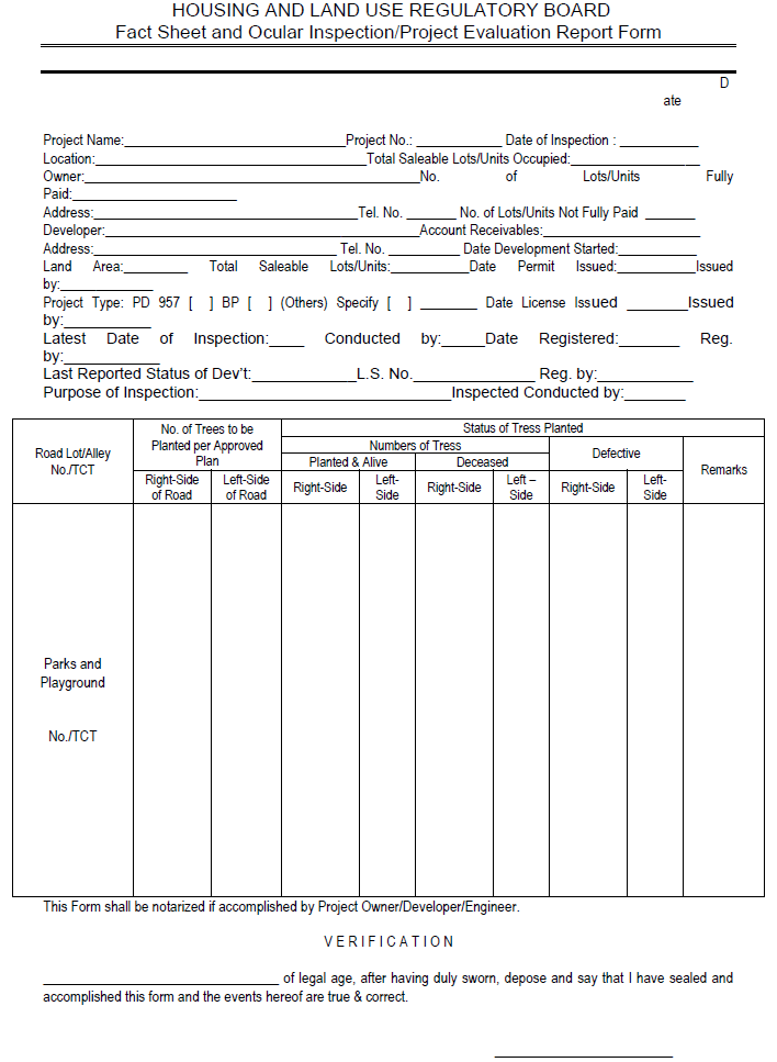Section 7. MONITORING OF COMPLIANCE – Monitoring of compliance to these rules shall form part of the regular monitoring activities of the Board. The HLRB or its deputees shall monitor compliance to this requirements by accomplishing the prescribed inspection report (Annex A of this Rules). The report as prescribed per Annex A shall be accomplished for every inspection conducted after the issuance of the license to sell and shall be an integral part of the report form prescribed under Office circular 11, Series of 1990. Non compliance to the tree planting requirements shall be a cause for cancellation of License to Sell.