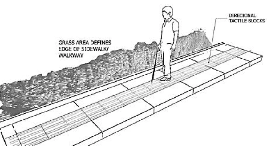 Warning Tactile Blocks – A standardized tactile surface feature built in or applied to walking surfaces or other elements to warn visually impaired people of upcoming hazards. (Often a paver insert composed of tactile raised truncated domes, applied perpendicular to the hazard.)