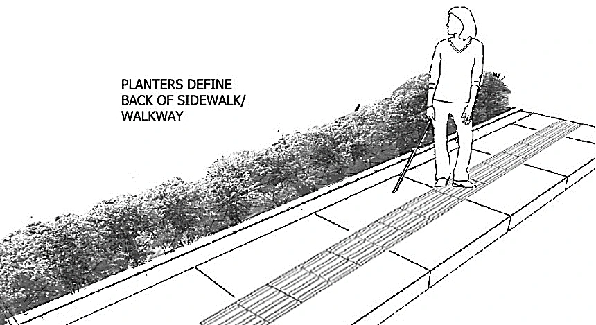 Visual Warnings – The use of contrasting surface colors to indicate a change in environment, such as at a curb ramp where the sidewalk changes to the street.
