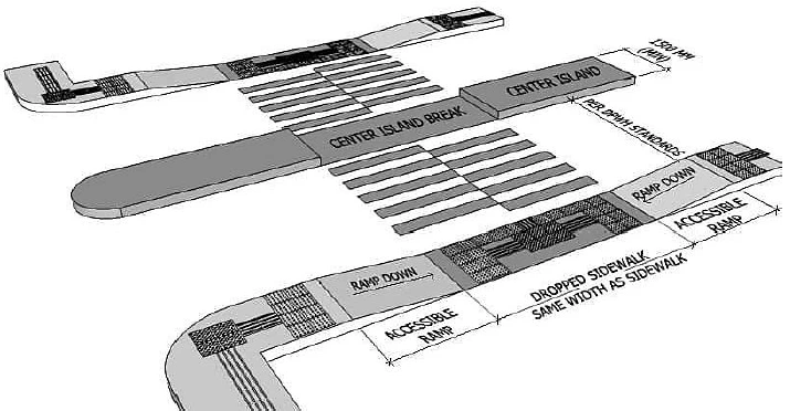 Curb Ramp – A break in the sidewalk or traffic island provided with an inclined surface to facilitate mobility of persons with disability; sloped area cut into a curb.