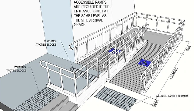 Accessible Entrances – An accessible path leading to the entrance of the building, must be level or have a curb ramp.