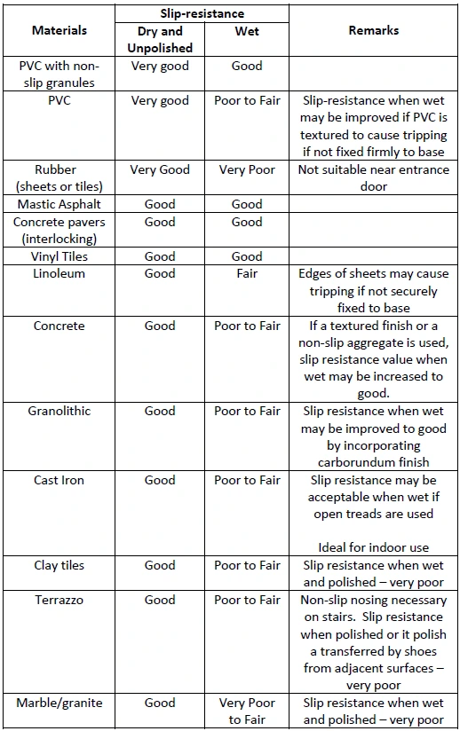 Slip Resistance – the relative force that resists the tendency of the shoe or foot to slide along the walkway surface. Slip resistance is related to a combination of factors including the walkway surface, the footwear bottom, and the presence of foreign materials between them.