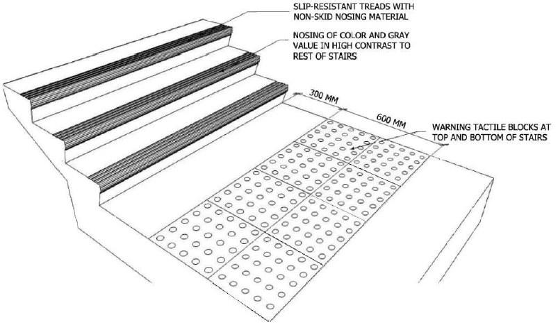 Tactile Floor Surfaces – Textured floor finishes also known as truncated floor finishes, detectable warning devices, blistered surfaces that can be used as non-skid materials. Referred to as warning, positional, and directional blocks to warn visually impaired persons of danger or indicate facilities besides, or an indicator to make a turn in direction.