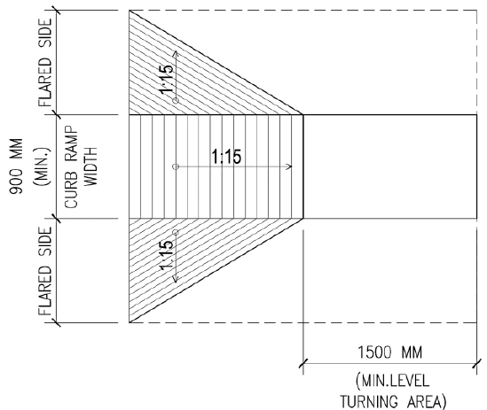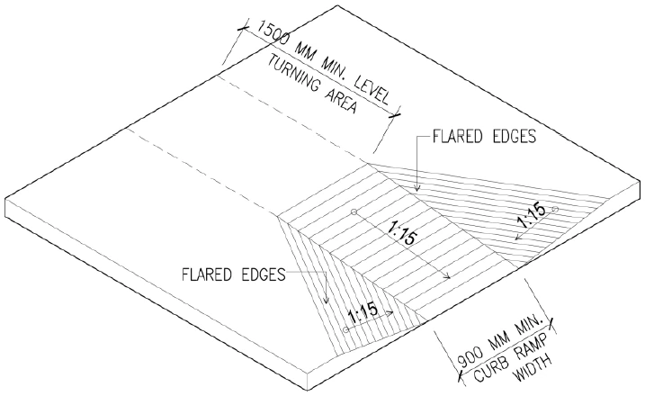 Flare – A sloped surface that flanks a curb ramp and provides a graded transition between the ramp and the sidewalk. Flares bridge differences in elevation and are intended to prevent ambulant persons with disabilities from tripping. Flares are not considered part of the accessible route.