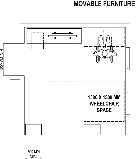 • Note: Wheelchairs, including motorized ones, can vary in terms of size, weight, and ease of maneuvering. When assessing the space needed for wheelchair users to move around, the specific dimensions of the wheelchair being used and the occupant’s ability to navigate it shall be taken into consideration.