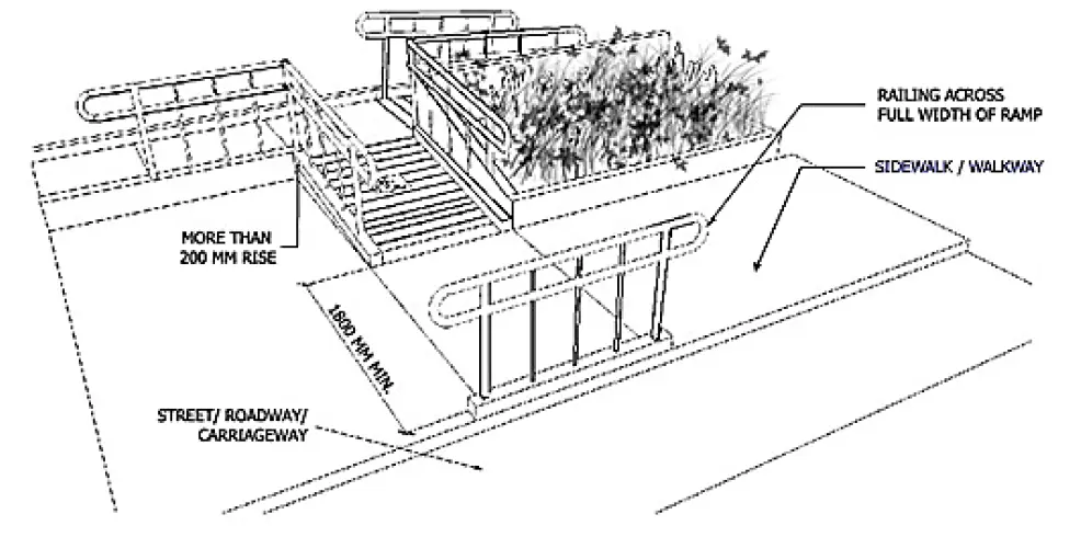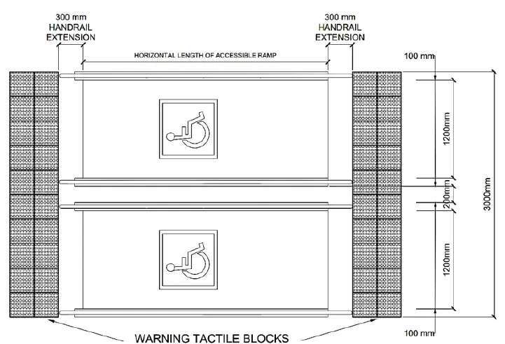 Slope – The slope of a ramp is expressed as the height to the length (i.e., 1:16 indicates for each 1 m in height, there is 16 m in length).