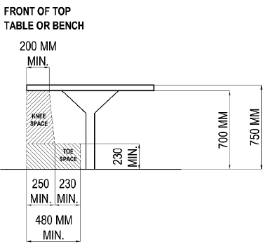 5. The comfortable clearance for knee and leg space under tables for wheelchair users is 0.70 m.