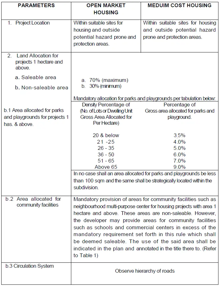Mandatory provision of areas for community facilities, such as neighborhood multi-purpose center both for open market and medium cost housing projects with area one (1) hectare and above. These areas are non-saleable. However, the developer may provide additional areas for community facilities such as schools and commercial/retail centers in excess of the mandatory requirement set forth in this rule which shall be deemed saleable. The use of the said area shall be indicated in the plan and shall be annotated in the title thereto. (Refer to Table 2)