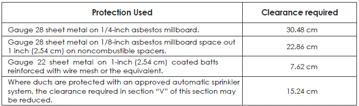 (1) The type of protection specified is applied to and covers all surfaces of combustible material within the distance specified as the required clearance with no protection.