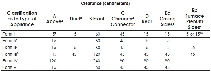 TABLE 44: CLEARANCES TO COMBUSTIBLE MATERIAL