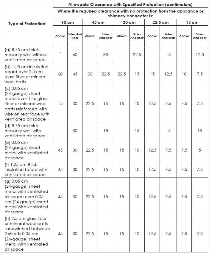 (10) Provide at least 1 in. (25 mm) between the appliance or connector and the protector. In no case is the clearance between the appliance or connector and the combustible material to be reduced below that allowed in the table.