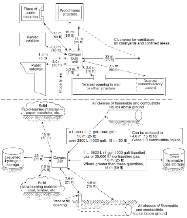 These distances do not apply where protective structures having fire resistance rating of two (2) hours interrupt the line-of-sight between un-insulated portions of the bulk oxygen storage installation and the exposure. The protective structures protect un-insulated oxygen storage containers or supports, control equipment, and system piping (or parts thereof) from external fire exposure. Liquid oxygen storage containers are insulated. Such containers may provide line-of-sight protection for un-insulated system components. Interruption of the line-of-sight means that an “eye” on any part of the un-insulated portion of the bulk oxygen storage installation cannot “see” any part of the exposure.